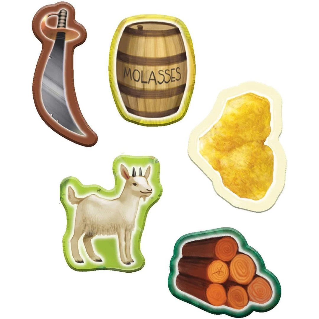 Catan: Junior takes place on a ring of islands where 2 to 4 players build hideouts and encounter the mysterious Spooky Island, where the Ghost Captain lives. Each island generates a specific resource: wood, goats, molasses or swords, and players can acquire gold. Each player starts with two pirate hideouts on different islands, and they can use the resources they acquire to build ships, hideouts or get help from Coco the Parrot. By building ships, they can expand their network; the more hideouts they build, the more resources they may receive. Just watch out for the dreaded Ghost Captain! For Ages: 8 – 108