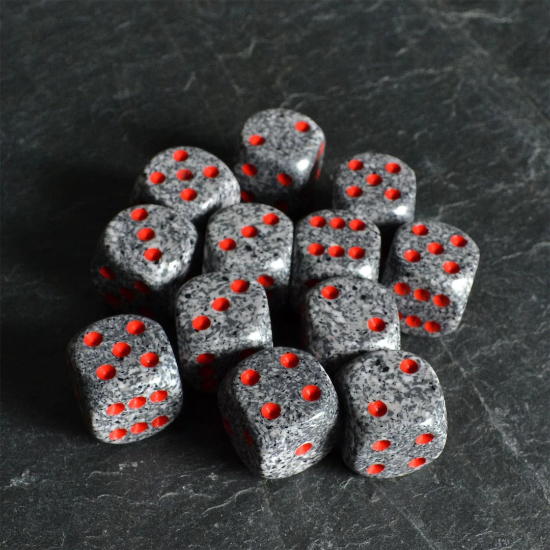 Set of 12 Speckled 16mm pipped D6 Dice in Granite colour by Chessex.