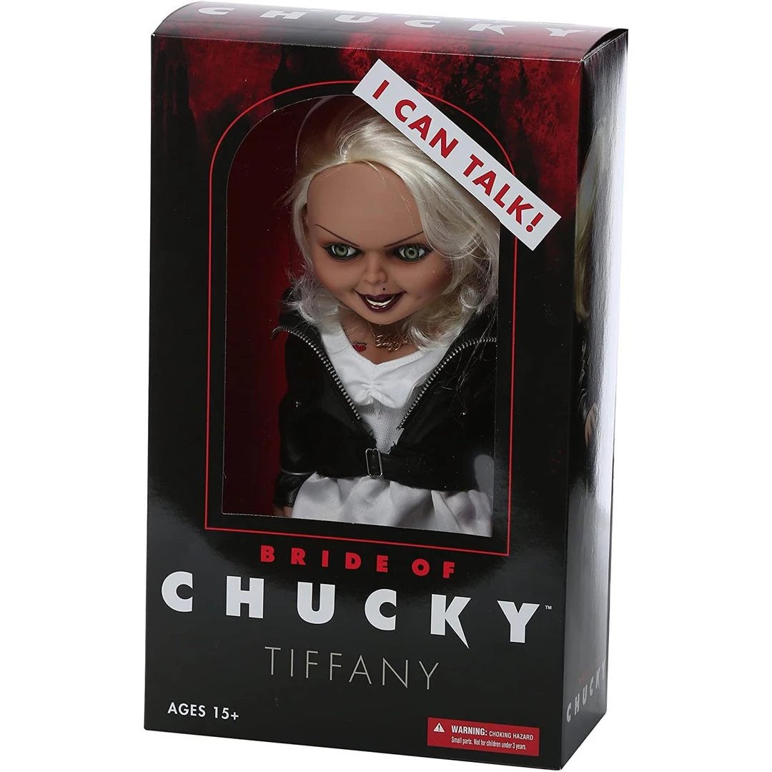 Tiffany is as deadly as she is beautiful; a perfext mate for Mezco’s previously released 15″ Chucky Good Guy figure. Tiffany is perfectly screen- matched from her bleached- blond hair to her black work boots. Dressed in her bridal gown with ” Leather ” jacket, she comes complete with her TIFF Necklace, tattooed decollectage, and lacquered fingernails. Just as she did in Bride Of Chucky, Tiffany has lots to say. She speaks six phrases direct from the film, activated by a discrete button on her back. Tiffany also features realistic glass-like eyes, and nine points of articulation. Tiffany comes packaged in her own collector friendly window box.