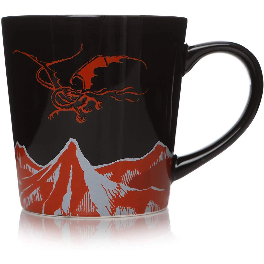 This epic mug inspired by The Hobbit film trilogy is perfect for breathing a little dragon fire in your morning coffee. The mug features an attractive navy blue base colour, which is contrasted by mountain illustrations along its bottom edge with hints of orange, while the front of the mug has illustrations of Smaug dragon flying in the sky, and on the back of the mug, reads “The Hobbit: the Desolation of Smaug”.