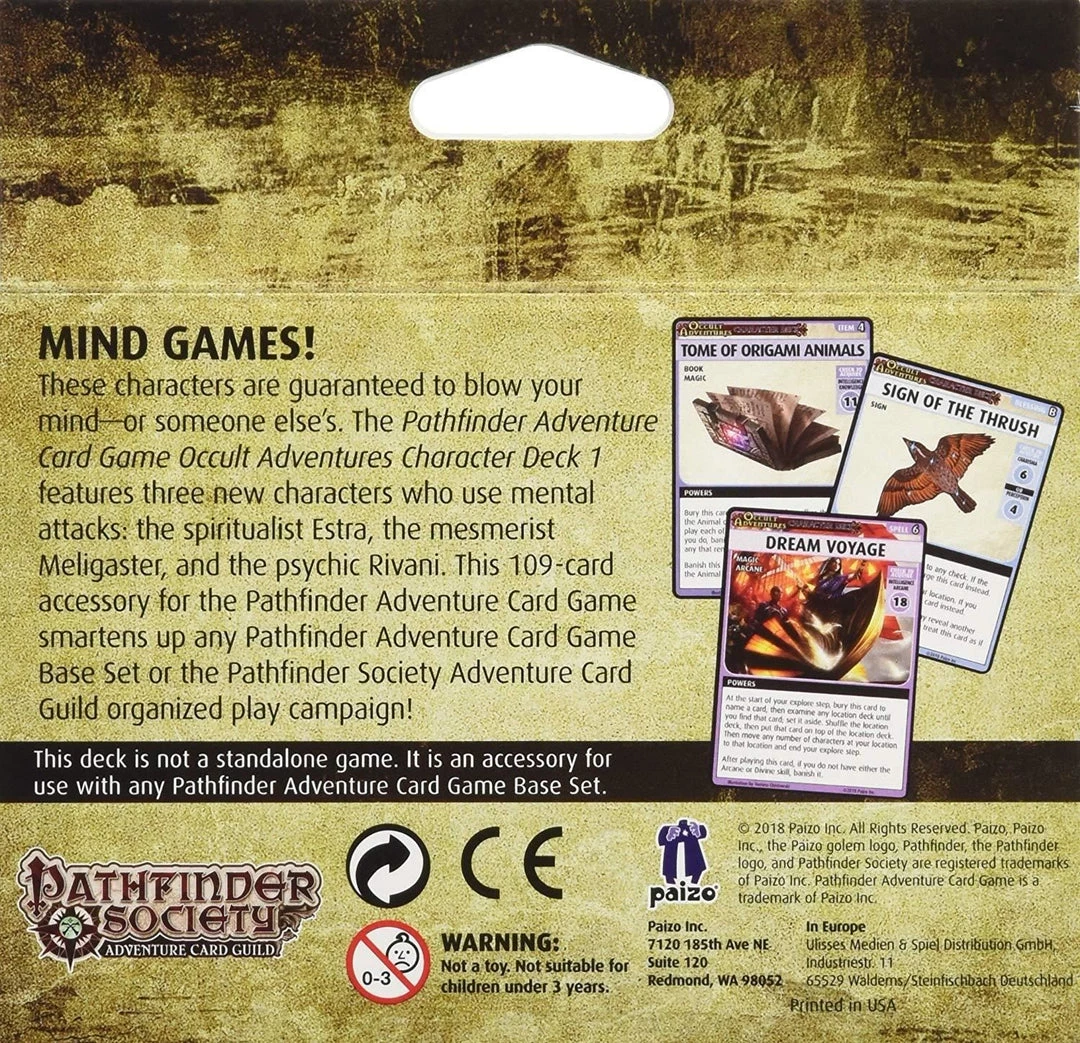 These characters are guaranteed to blow your mind-or, if you prefer, someone else’s. The Pathfinder Adventure Card Game Occult Adventures Character Deck 1 features three new characters who use mental attacks: the spiritualist Estra, the mesmerist Meligaster, and the psychic Rivani. This 109-card accessory for the Pathfinder Adventure Card Game gives you the cards you need to add some brain to your game. Use in any Pathfinder Adventure Card Game Base Set or in the Pathfinder Society Adventure Card Guild organized play campaign!