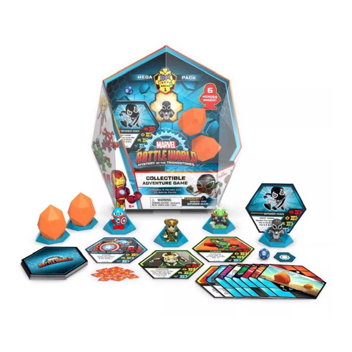 Pick your favourite Hero, rescue your friends, and win battles to defeat Thanos! Battleworld is a revolutionary, cooperative expandable, collectible adventure game featuring dozens of characters from all over the Marvel universe! Players get to crack open the mysterious Thanostones during the course of play to reveal the mystery character inside for a constant sense of surprise and delight! Mega Packs let you jumpstart your collection with six characters: Four starting Heroes [including an exclusive Loki (Frost Giant) Variant] and two more trapped in Thanostones! Gameplay features: • Unique team-based or solo gameplay allows players to jump into Battleworld straight away! • Collectible characters come with their own game cards for immersive, cooperative play. Collect all the unique powers and abilities. • Free the mystery character from the Thanstone. Each time you crack one open, it’s a surprise! • Launch series includes 30+ unique characters including rare variants! Includes a new Hero ONLY available in this Mega Pack – Loki (Frost Giant) Game Highlights: • Gamy by Funko • Collectible adventure game • Ages 6 and up • For 1-4 players • 15-30 mins Gameplay time Game Contents: • 1 exclusive Hero – Loki (frost Giant) • 1 exclusive Hero card • 3 Heroes • 3 Hero cards • 2 Thanstones containing 2 Mystery Heroes • 2 Mystery Hero cards • 6 Hero stands • 13 battle cards • 1 attack dice • 13 danger tokens • 1 danger coin • Instructions